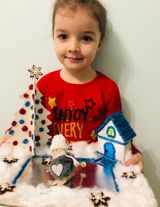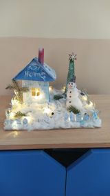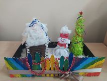 Разнообразные ёлочки, забавные снеговики, заснеженные домики, грациозный белоснежный олень – всё сделано руками детей и родителей.